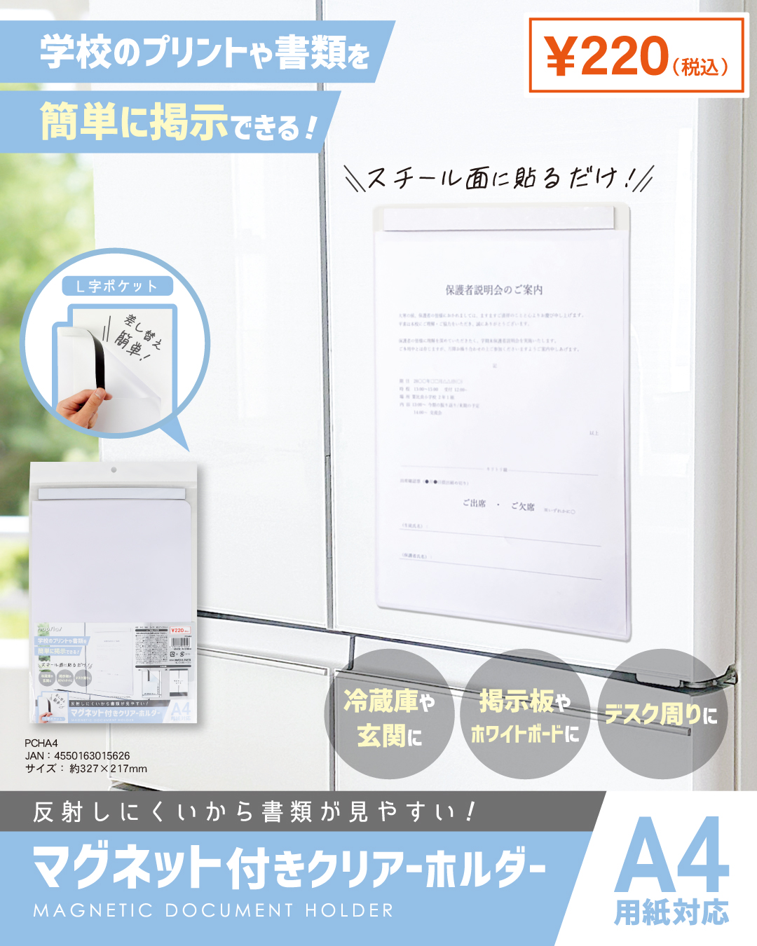 商品名:マグネット付PVCホルダー 品番:PCHA4 JAN:4550163015626