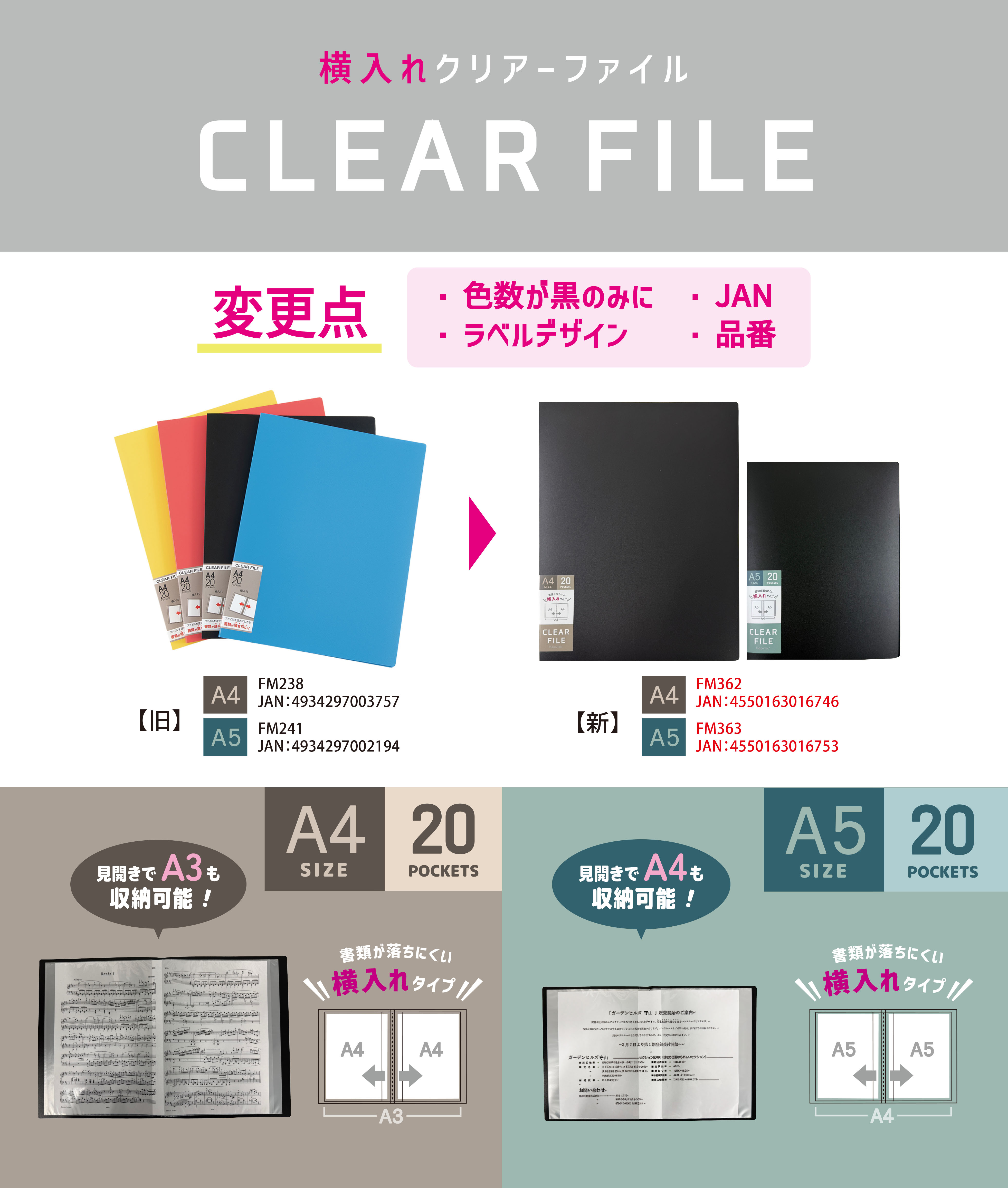 商品名:クリアーファイルA4横入れ20P 黒、クリアーファイルA5横入れ20P 黒