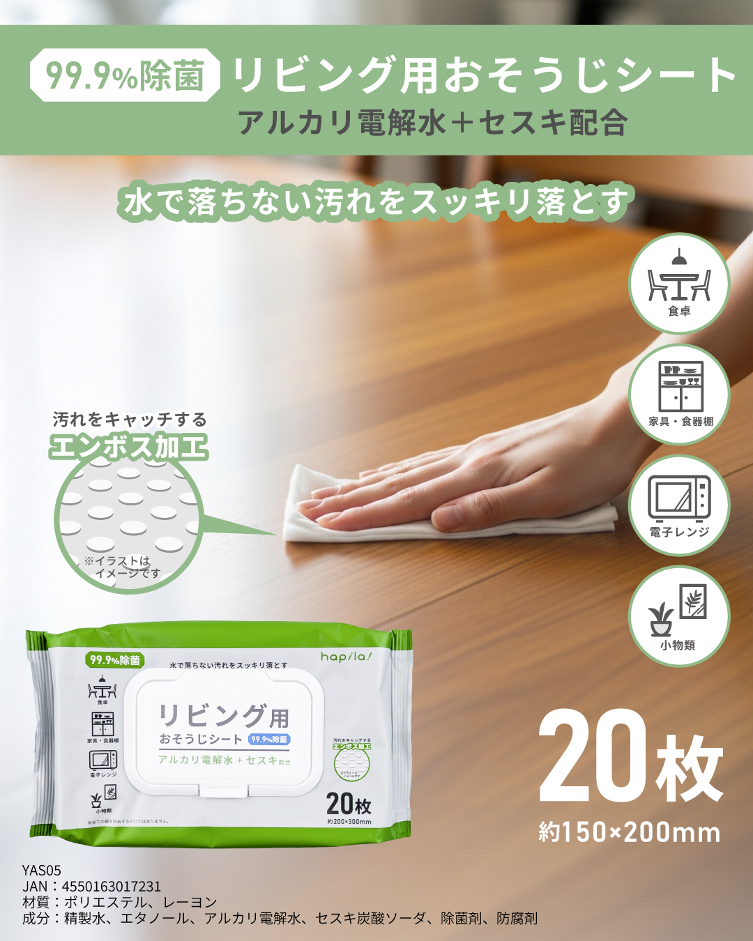2026/2/19:アルカリ電解水とセスキ炭酸ソーダを配合したウェットシート。水で落ちにくい汚れを浮かせて落とします。界面活性剤不使用のため二度拭き不要。