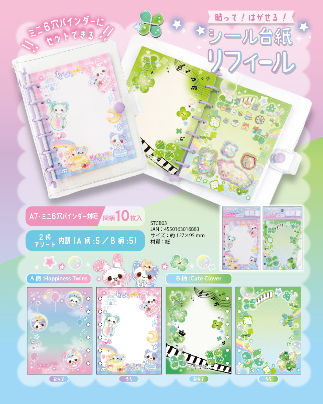 2026/2/27:6穴バンダーに挟んで使用するシールを貼ってはがせるシール台紙。HapinessTwinsとCuteCloverの2柄展開。