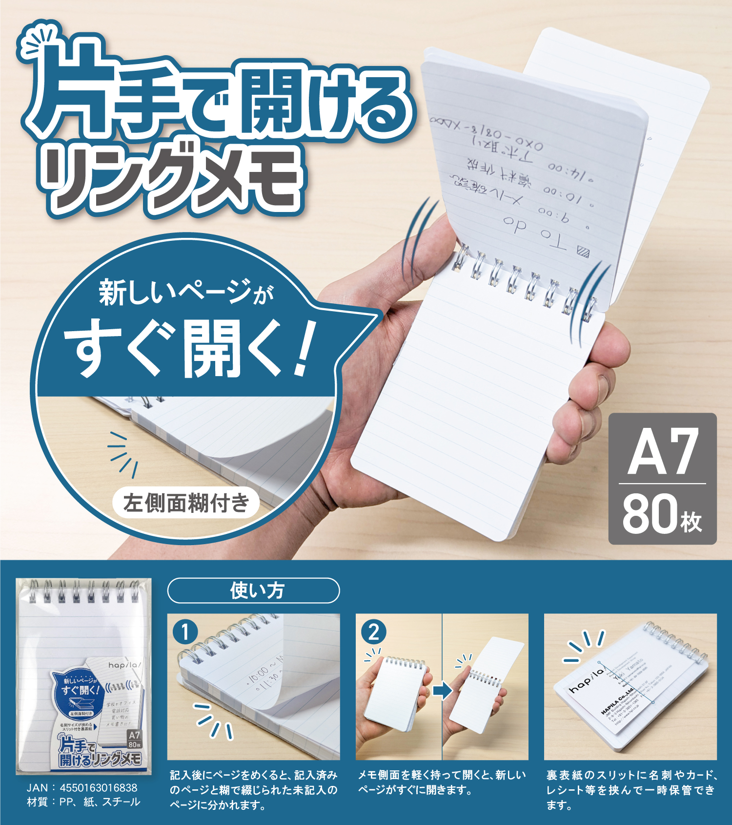 2026/3/18:新しいページがすぐ開く!側面が糊付けされたリングメモ。
