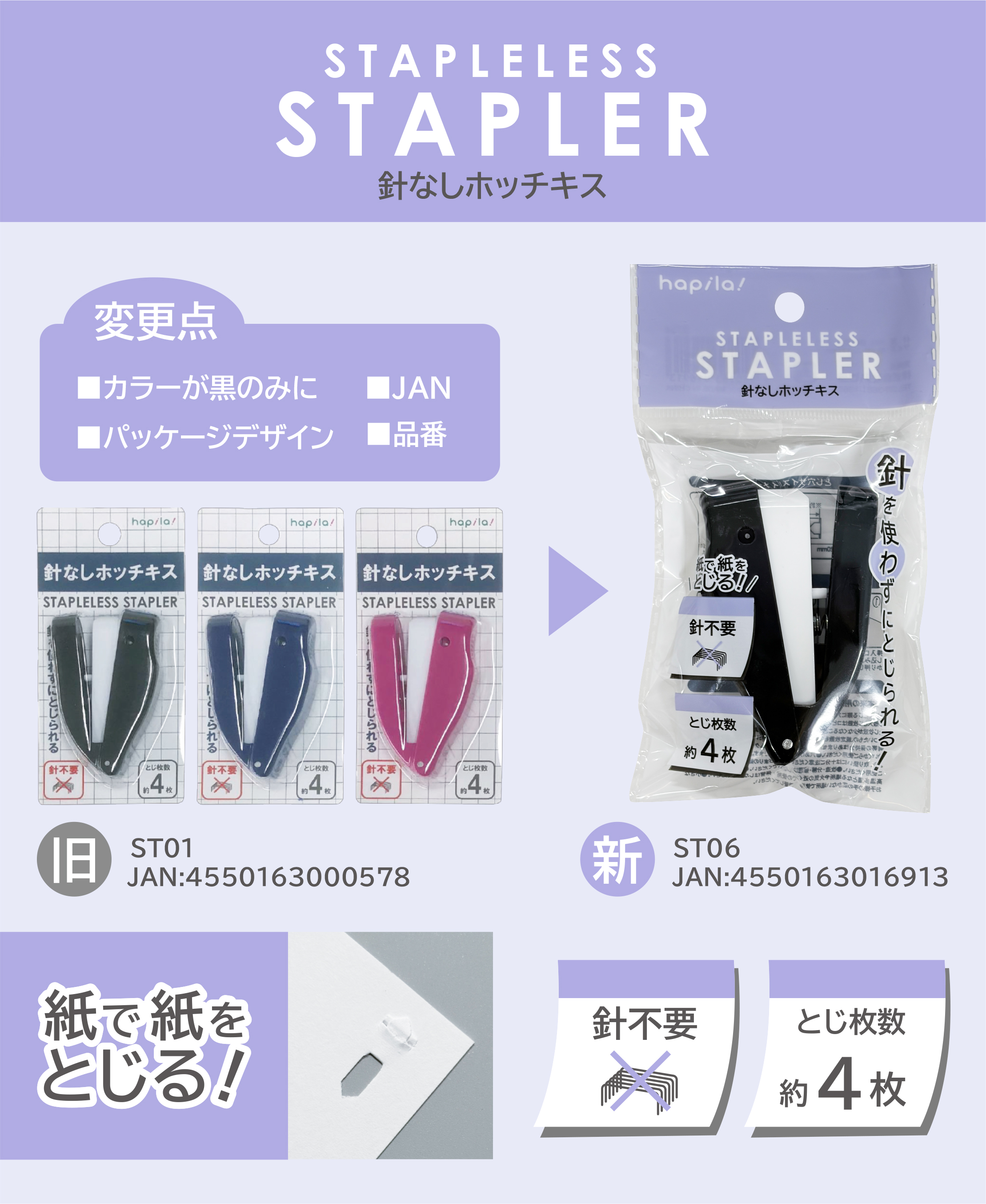 商品名:針なしホッチキス 品番:ST06 JAN:4550163016913