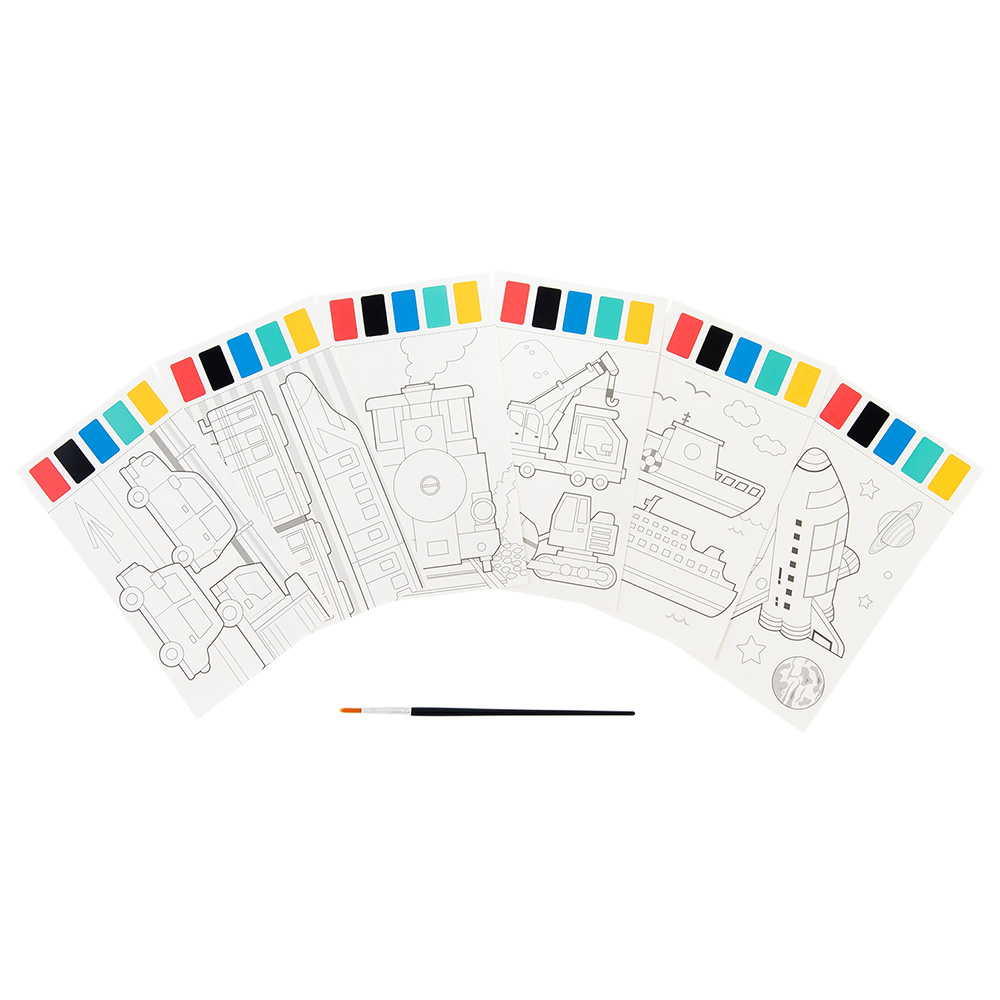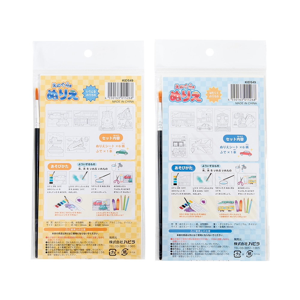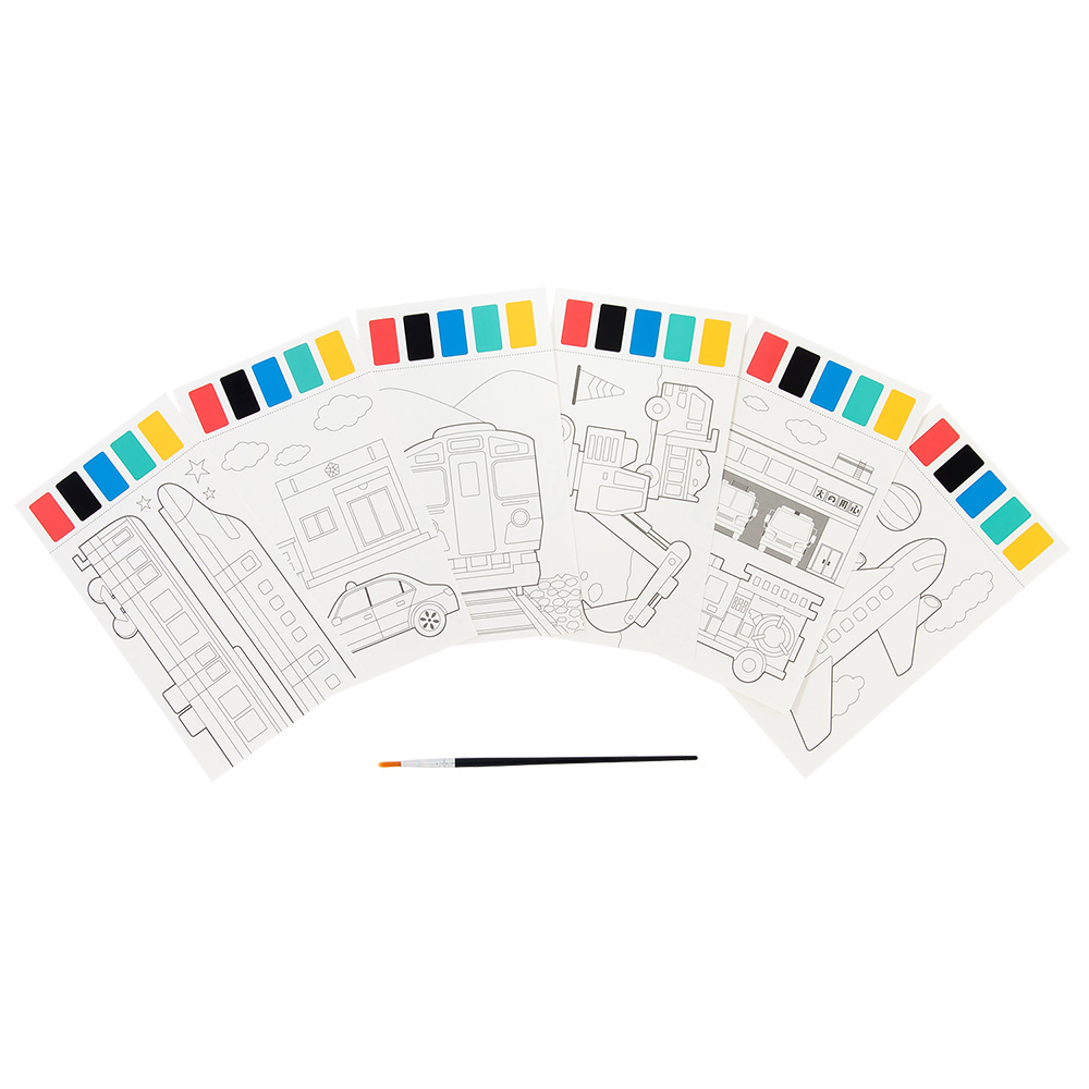 水で溶かす絵の具付きのぬりえ。ぬりえシート6柄と筆1本のセットです。