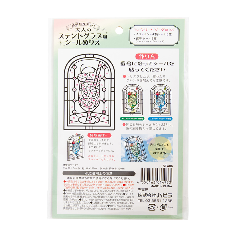 ぬりえ感覚でシールをペタペタ貼ると、透明感が美しいクリームソーダ柄のステンドグラス風アートが完成します。